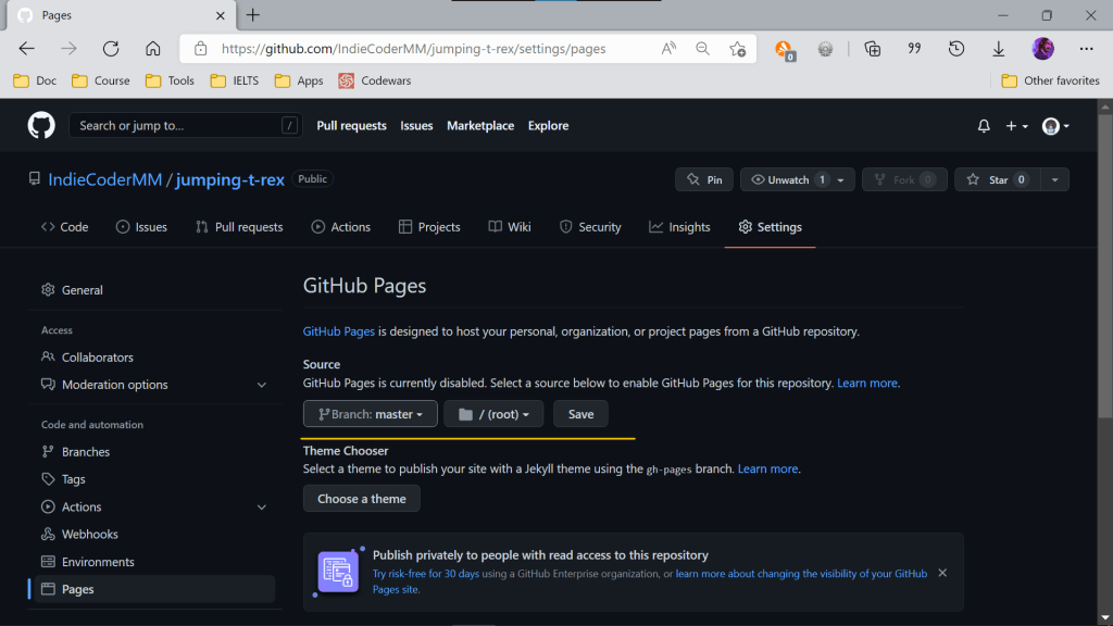 Github page ကို ဖွင့်ဖို့ အတွက် Setting > Pages ကို သွားပါ။ ပြီးရင် Source မှာ Repo branch ကို select လုပ်ပြီး Save လိုက်ပါ။